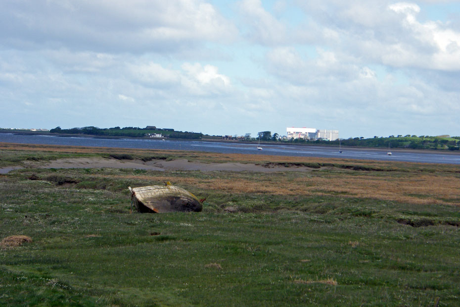Looking across the River Lune to Overton and the Power Stations at Heysham. The boat in the foreground is all that remains of the "Maud Raby" an ex Morecambe "Nobby". She was built in the early 1930's by Crosfields of Arnside probably one of the last to be built there.