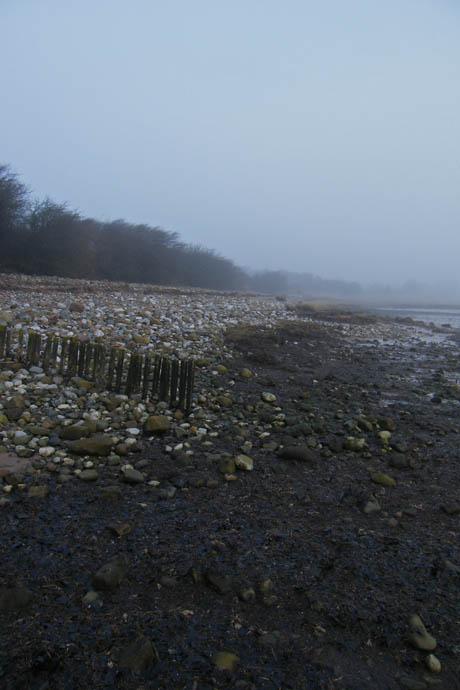 We parked at Sunderland where (l) I am looking back along the tidal road to Overton which apparently as disappeared. In the picture (r) we are walking towards First Terrace with the sun showing through the mist.