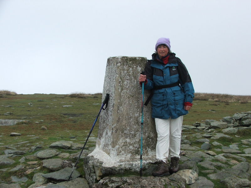 Edith on the summit of Thornthwaite Crag with its impressive beacon.