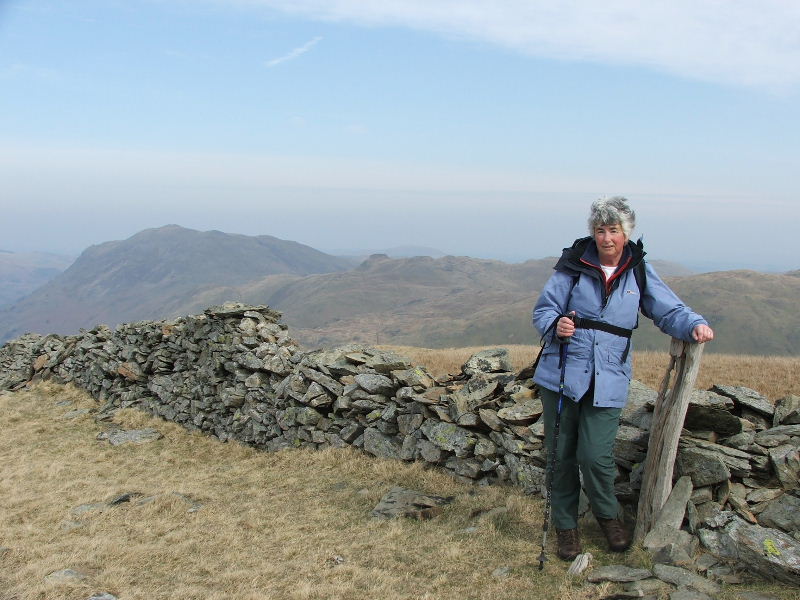 Edith on Caudale Moor with Gray Crag behind and the High Street Fells behind that.
