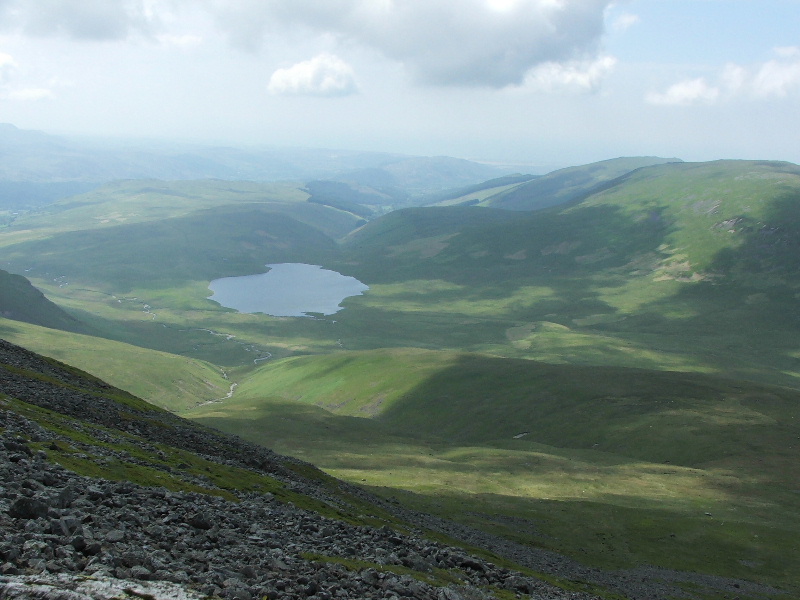 Looking down to Burnmoor Tarn where we were heading. Our track would take us to the right of the picture around Hardrigg Gill and then down the Hard Rig ridge down to the tarn.
