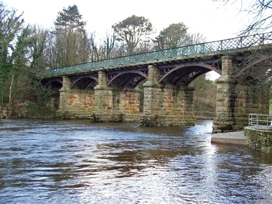 The road bridge at the Crook O'Lune. You can see the water rushing by the support piers.