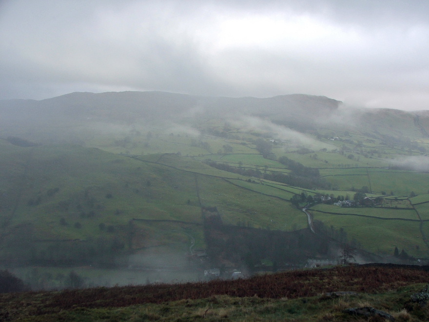 The weatherman had said that today would be the best day of the weekend so I had this little walk pencilled in a few days ago. When I put the cat out late last night the sky was cloudless so I thought I was in for a really good day. However the morning brought dark skies with quite low clouds but hoping that it would improve I set off for Staveley (Edith has still got a cold) and parked up there just before 10am. As I was putting my boots on it started with some light rain so I decided on trying Sods Law. This says that if I put all my waterproofs on it will usually fine up within minutes and the sun will come out. However today Mr.Sod was not for playing , in fact he served me up a double whammy.....(a) I had light rain on and off all the time on the fells.....then (b) when I returned to Staveley the sun came out!!