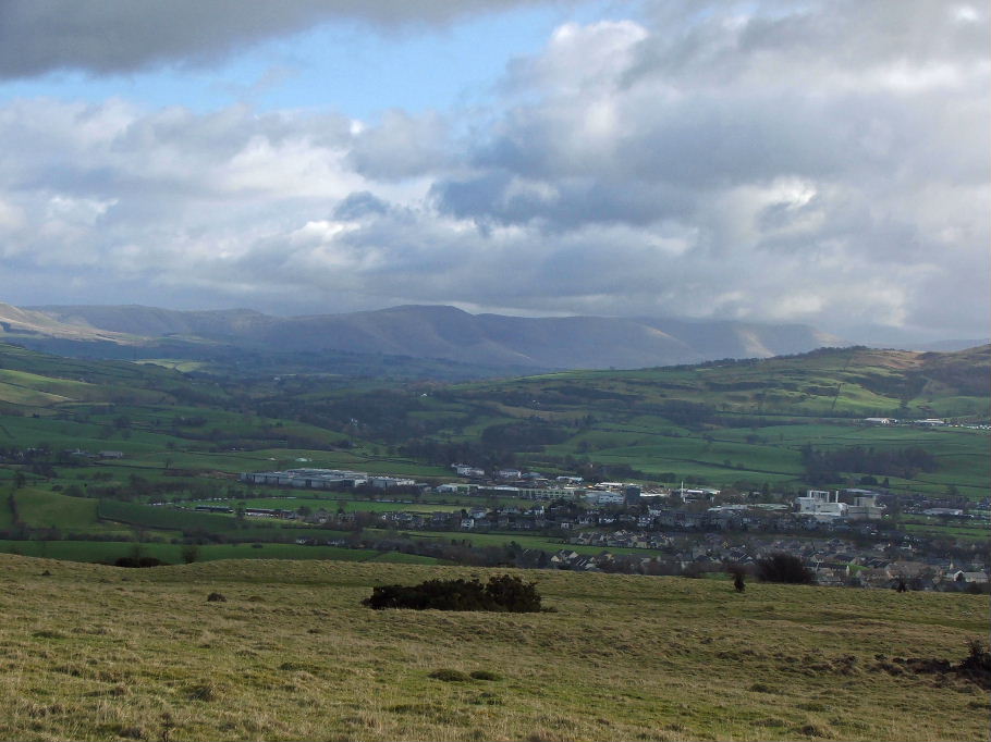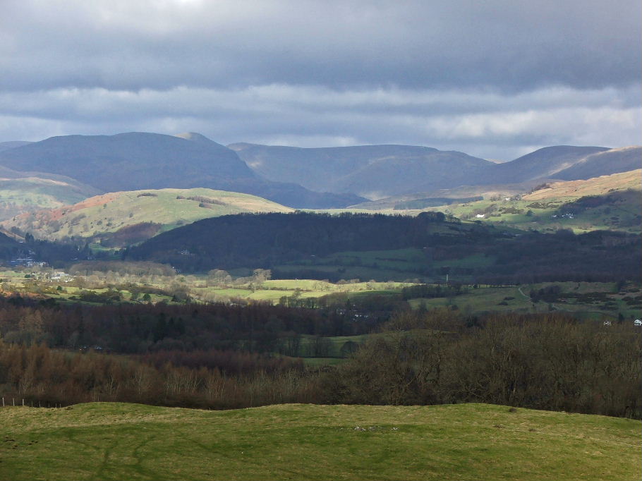 Looking towards the Kentmere Fells from Cunswick Fell. The Reston Scar , in shadow is on the left with Staveley below it.