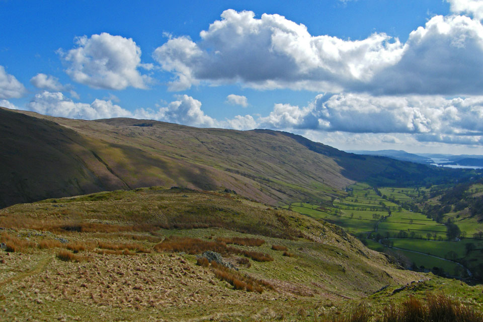 Looking down to Troutbeck Park with the Great Knott and Broad End ridges in front of Red Screes which is still in cloud