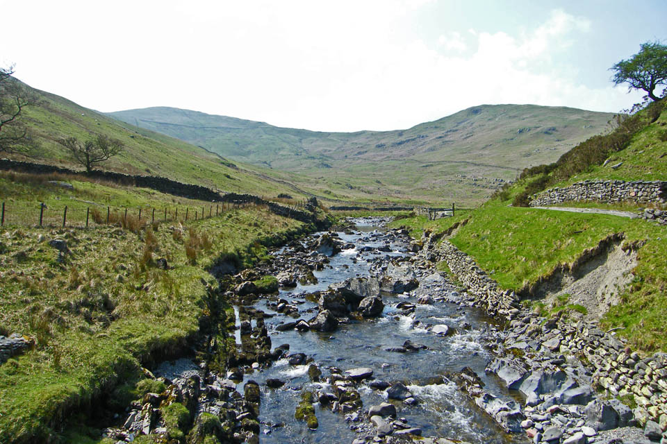 A look across the valley to Borrowdale Edge and Whinash. The track slanting upwards is called the Breasthigh Road which leads over into Bretherdale