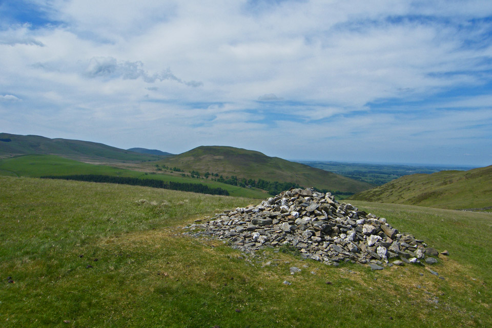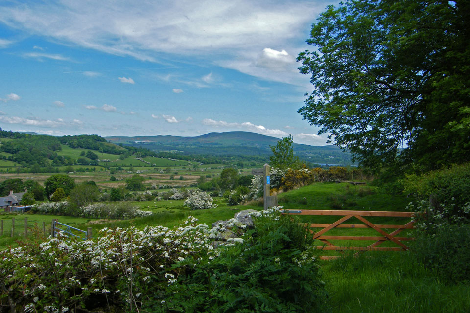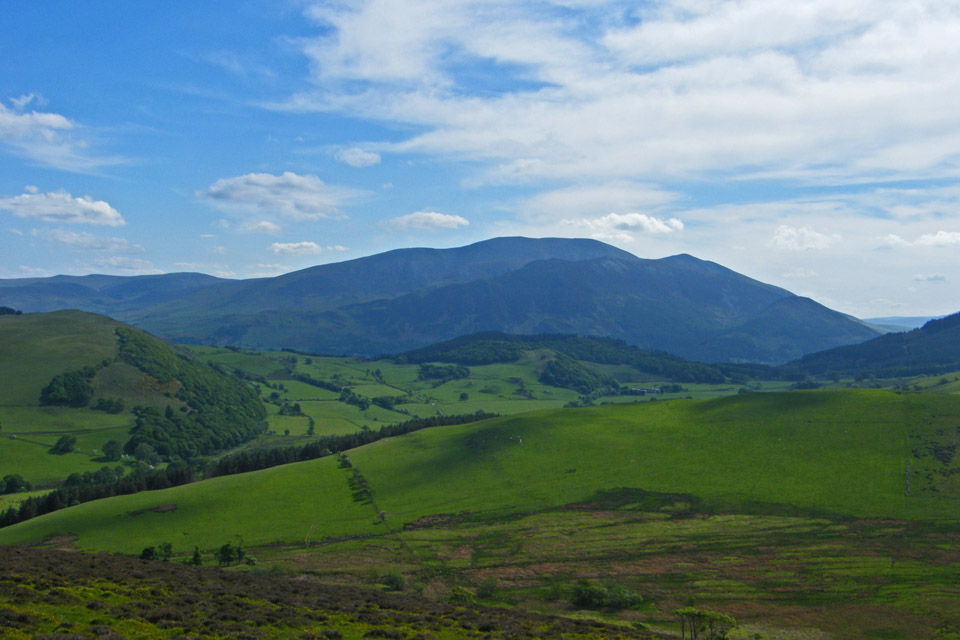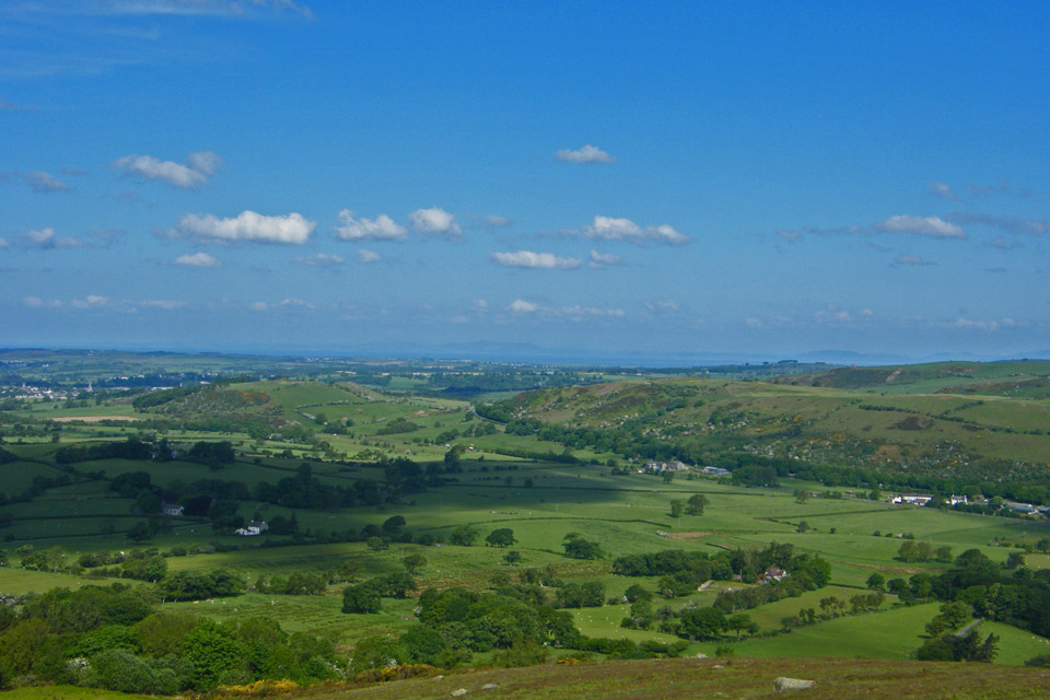 A look down into the Vale of Embleton and towards Cockermouth with the Scottish hills visible across the Solway Firth