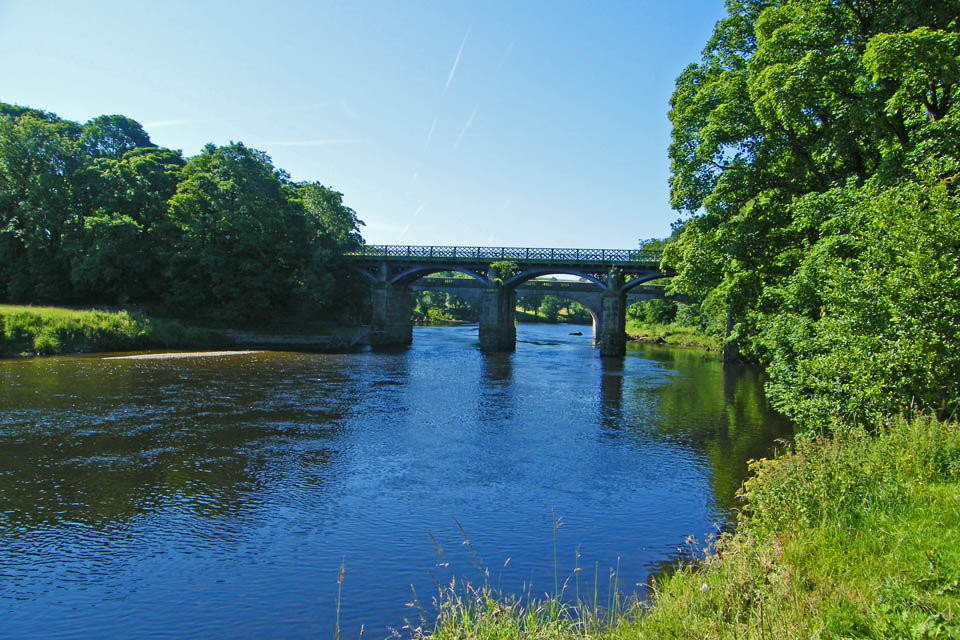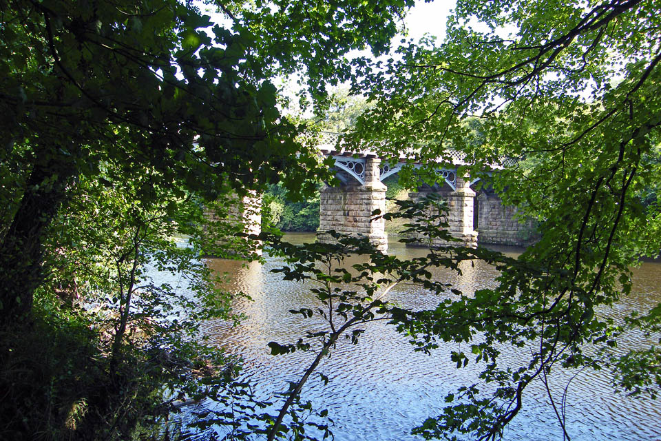 There are three bridges across the River Lune at the Crook O'Lune. Two of them are redundant railway bridges which now are a cycleway. The other is a road bridge. This picture shows one of the railway bridges in front of the road bridge.