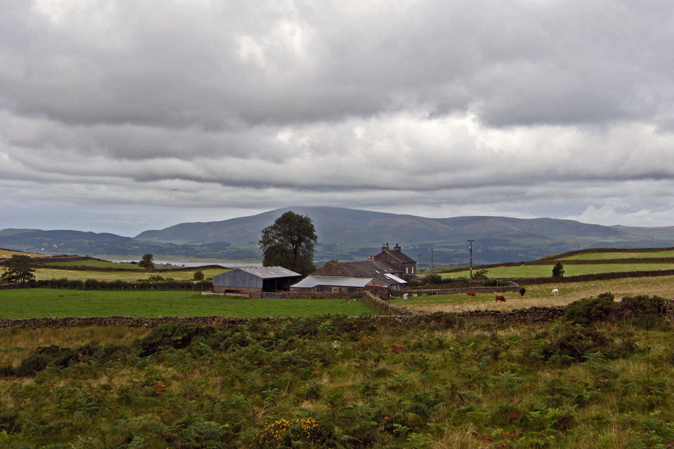 Looking over Moor House farm and the Duddon estuary to Black Combe
