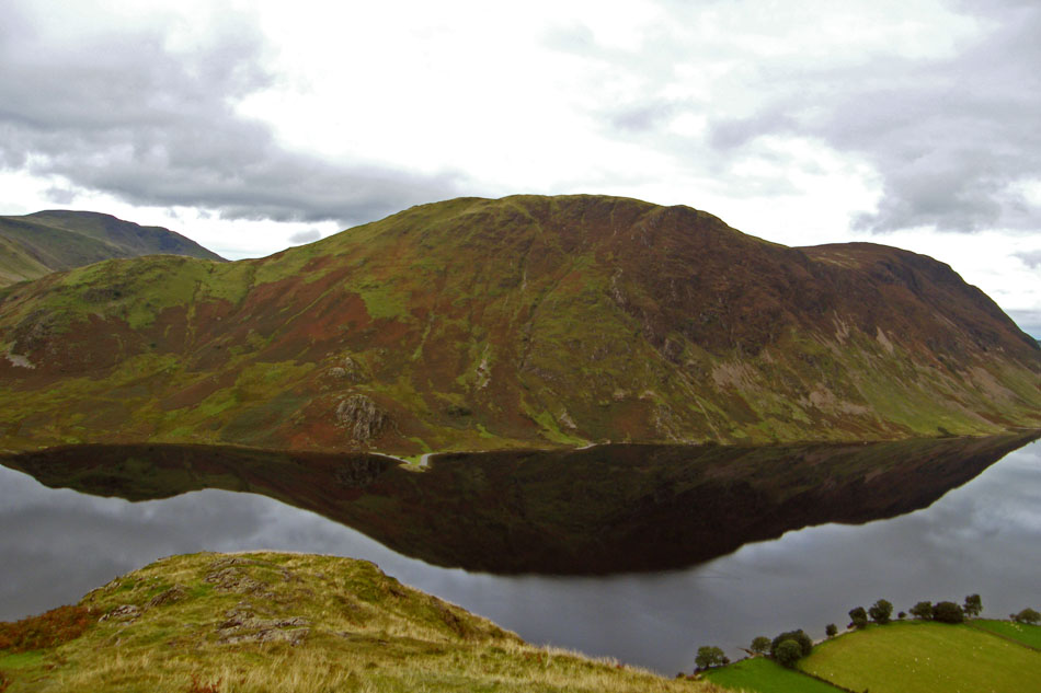 The south top of Mellbreak and Scale Knott are reflected in the calm water.