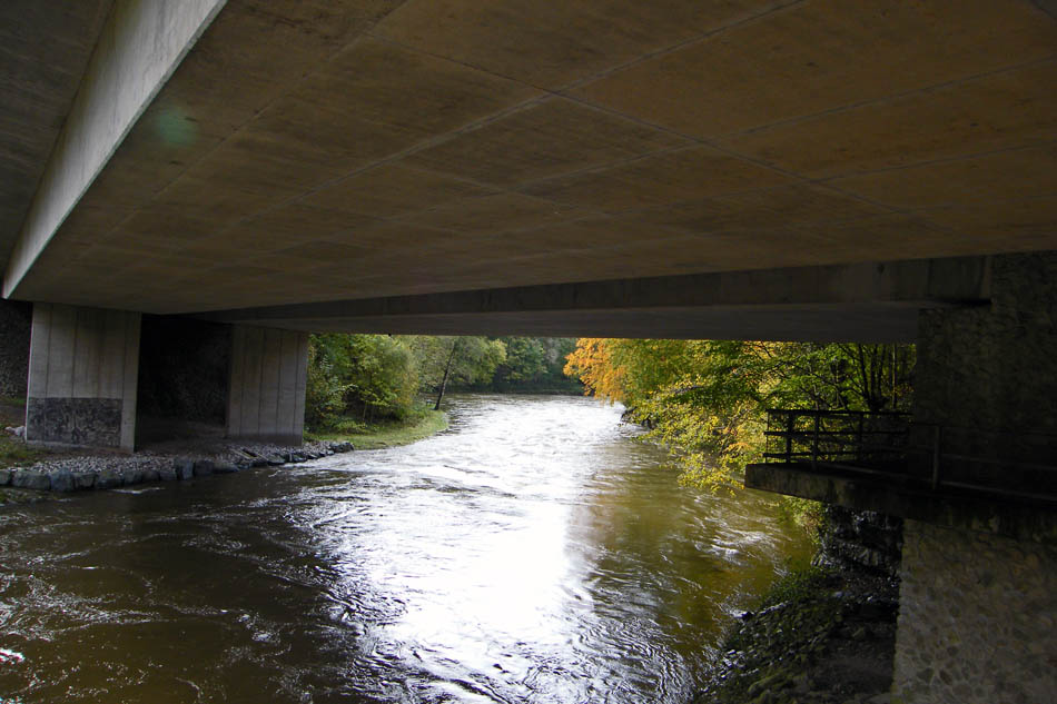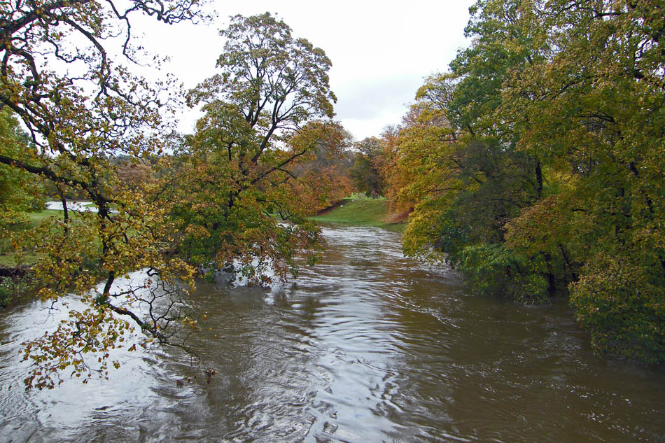 The River Kent from Levens Bridge. The river is well above its normal level but the level was dropping.