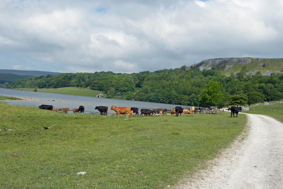 On the Pennine Way with Great Close Scar on the right. There were los of cows and calves walking below the scar on there way to the tarn.