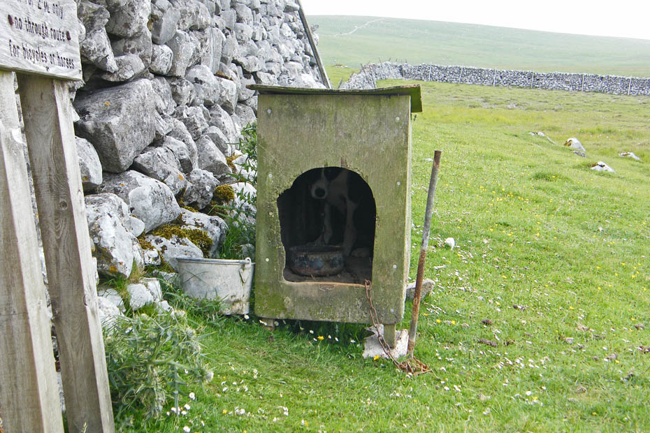 As soon as it saw us the farm dog got in the kennel and no amount of coaxing could get it to come out. What it was doing here I can't be sure. It was at least 3/4 mile from the farm down the lane next to a cattle grid. My best guess is that it was there to prevent the many calves from trying to cross the grid but I'll stand correction.