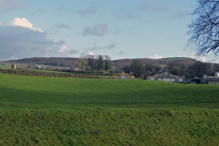 Looking over Cracalt Farm to The Helm. You can just see the church steeple at Natland on the left.