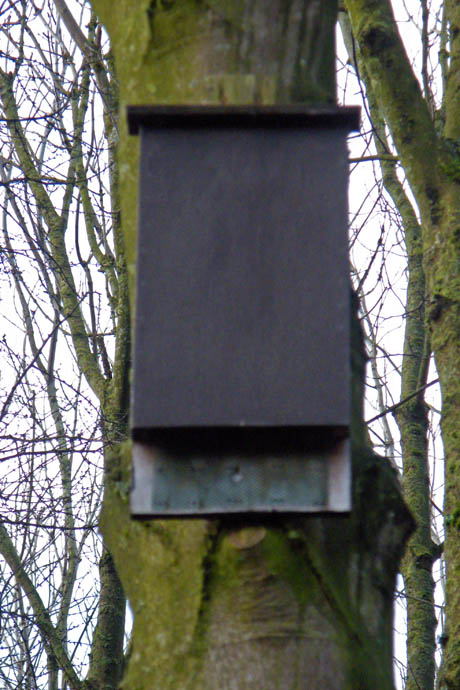 There were a number of these in the woods between canal & motorway. I think they are Bat boxes.