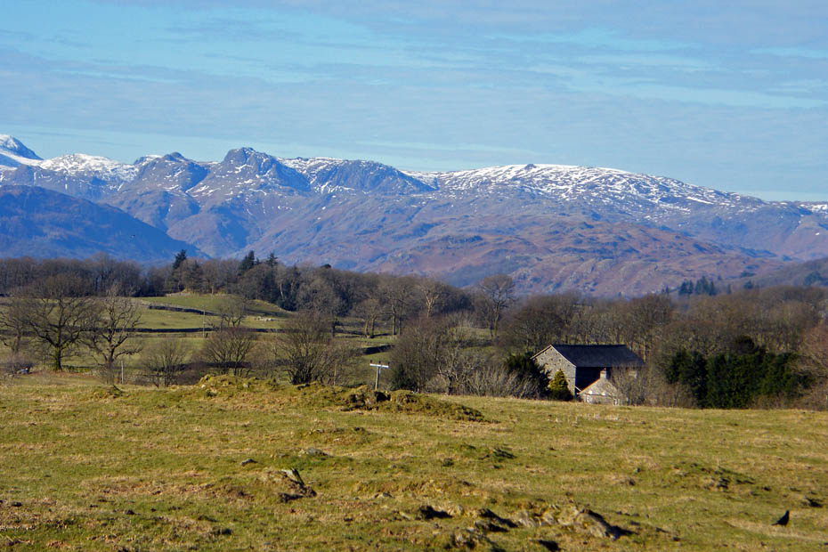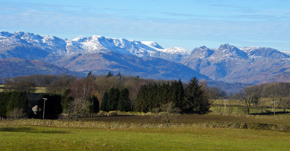The Crinkles, Bowfell and Langdale Pikes over Lingmoor.