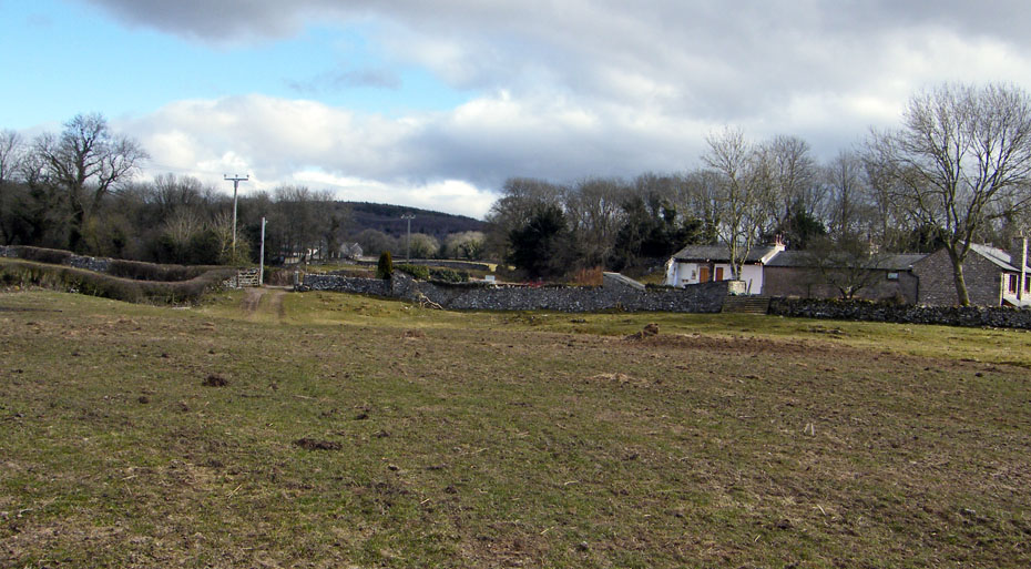 From the fingerpost the path rises slightly through a small field and then through a gate or stile into this more open space. To the left the land is used as a campsite and ahead is Hazelslack Tower Farm and Hazelslack Tower.