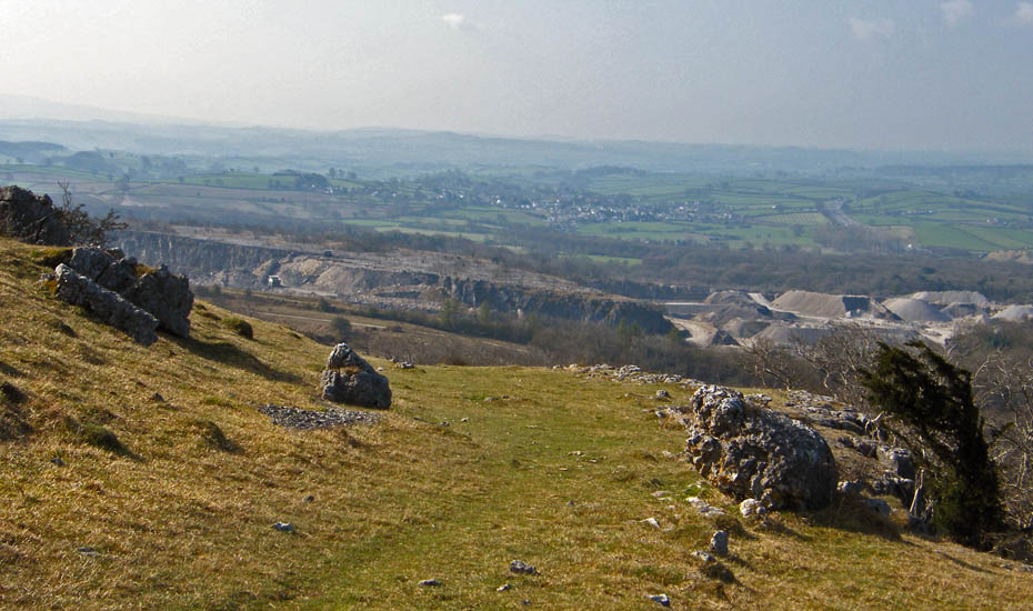 It was a wonderful morning. fine, sunny and warm but the views were very poor due to the haze, You can see the line of the bridleway going off to the left with the workings of Holme Park Quarry behind.
