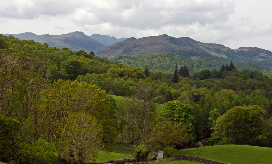 A view into Little Langdale with the Wrynose Pass in centre picture.