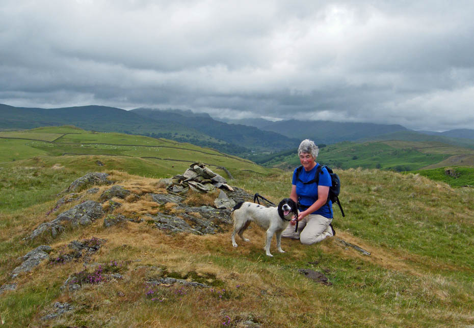 Back on the true summit of Hugill Fell she finds a watering stop near the cairn.