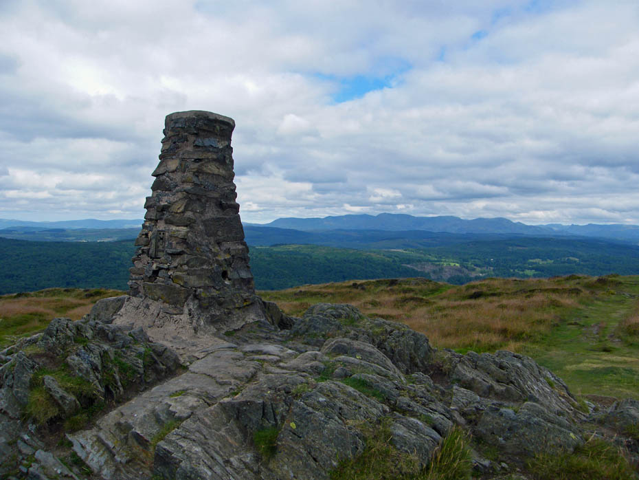Gummer's How summit with the Coniston and Langdale fells in the distance.