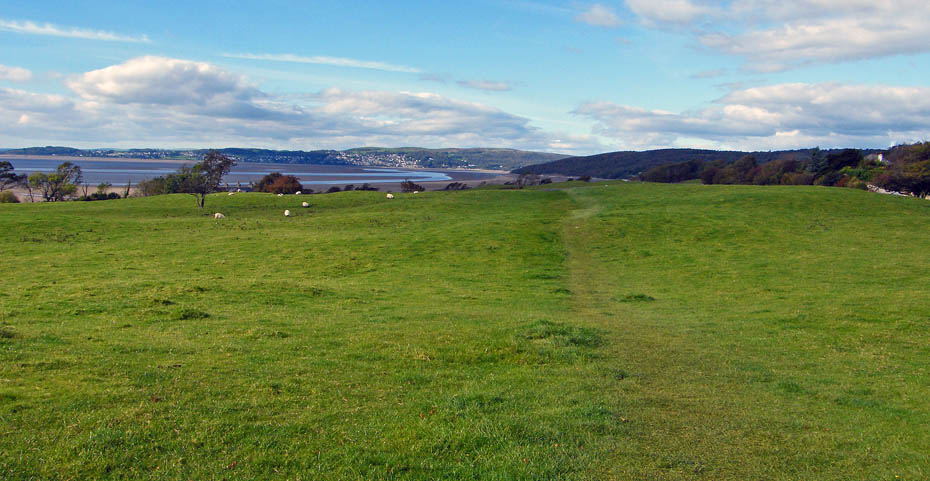 The path across The Lots towards The Cove with Grange and Hampsfell over the estuary.