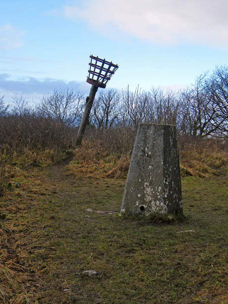 A short climb (l) on a rather slippy path leads us to the summit (r) with its triangulation point and leaning beacon.