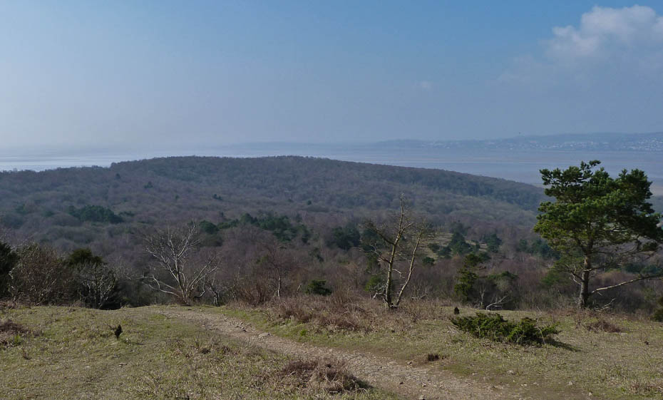 Almost at the top of Red Hills now and a hazy view across the estuary to Grange over Sands and Hampsfell.