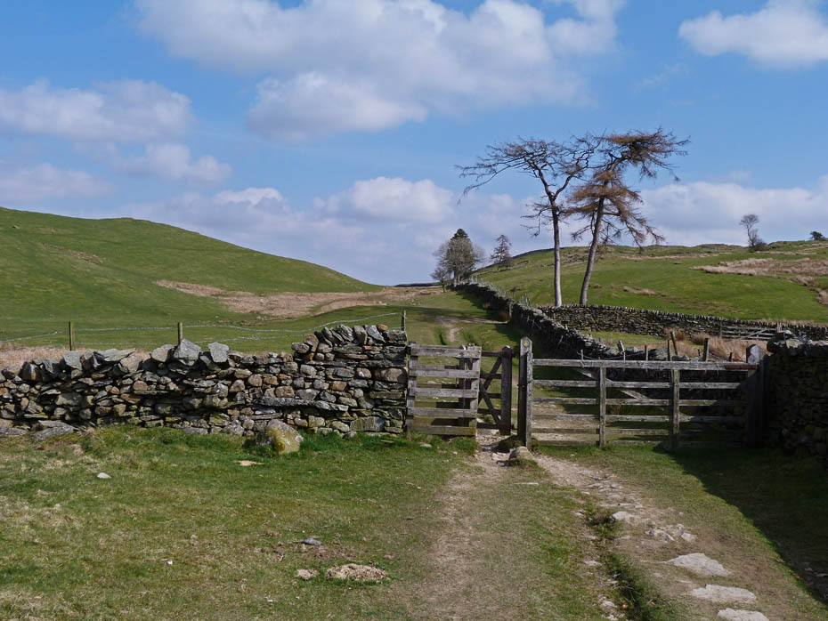 The tarmac lane soon gives way to a more natural surface as we reach the first gate with Red Screes and Wansfell ahead.