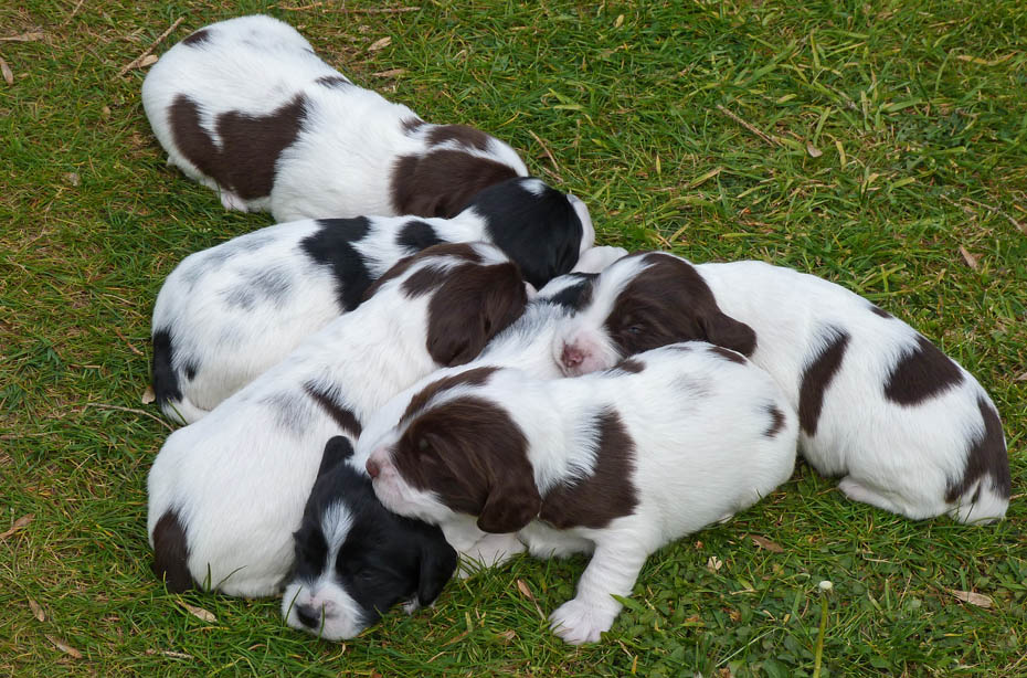 Roger showed me the recent arrivals which were in a box in the back porch cuddled up close. There are six of them, five dogs and one bitch and they are 17 days old.