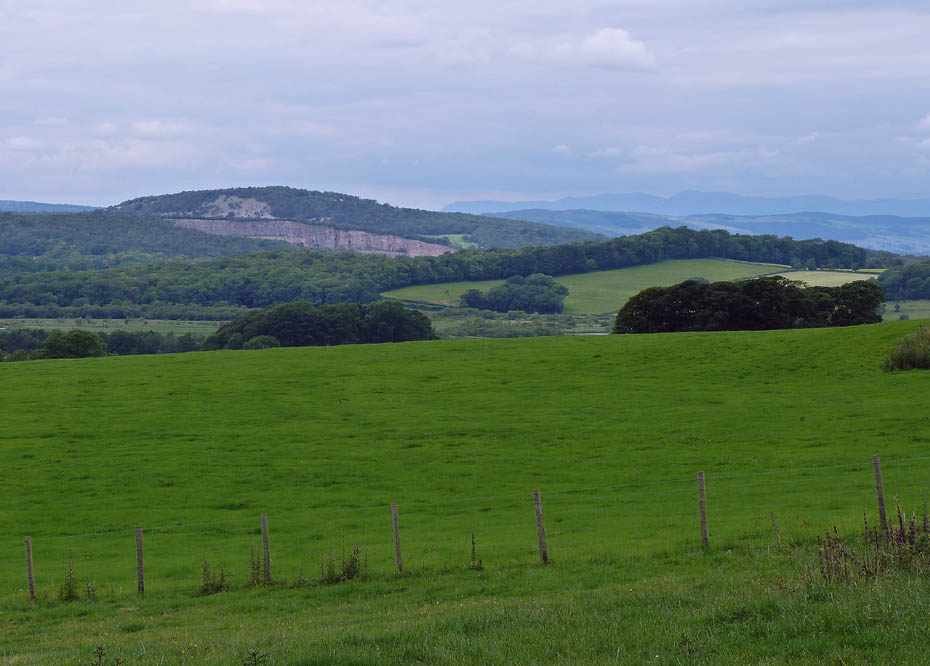 Arnside Knott behind the old quarry face at Middlebarrow with the Coniston Fells to the right.