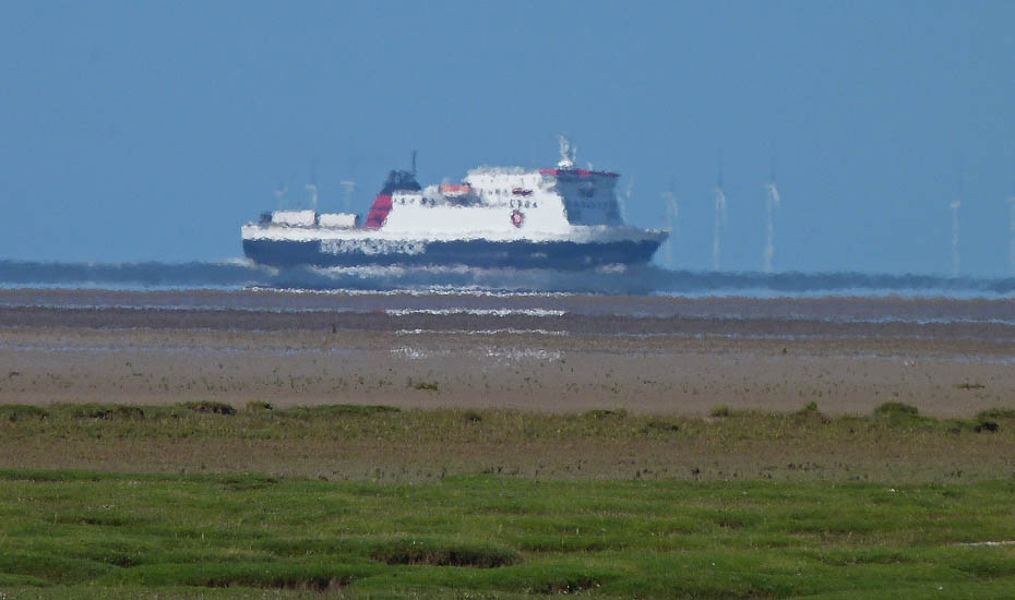 It's around noon and the Isle of Man ferry is just coming towards Heysham Harbour with the wind farm off Walney Island behind. The warm air rising from the sands however is distorting the picture.