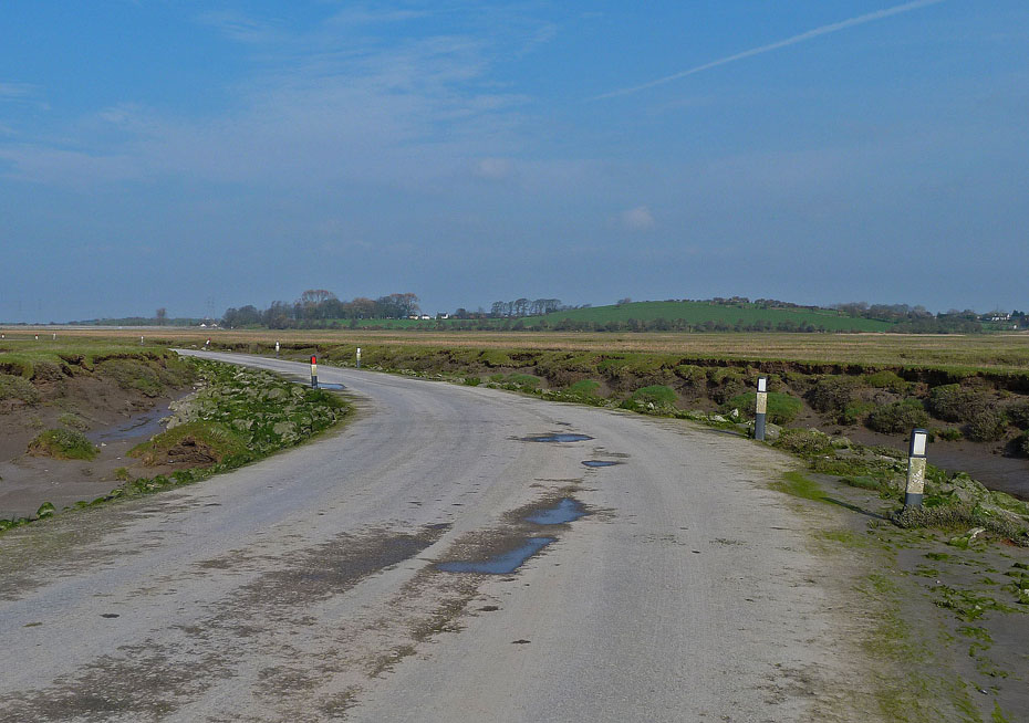 Looking across to the Hall Greaves as a van makes it way across the tidal road to Sunderland.